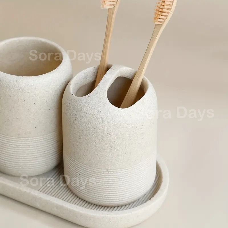 ソープディッシュ ソープホルダー 石鹸置き 洗面用具一式 5点セット シンプル ナチュラル おしゃれ モダン インテリア 北欧 ストーン風 無地 ディスペンサー 歯ブラシスタンド コップ トレイ 樹脂製 12 6 9 4 2 cm 27 3 10 5