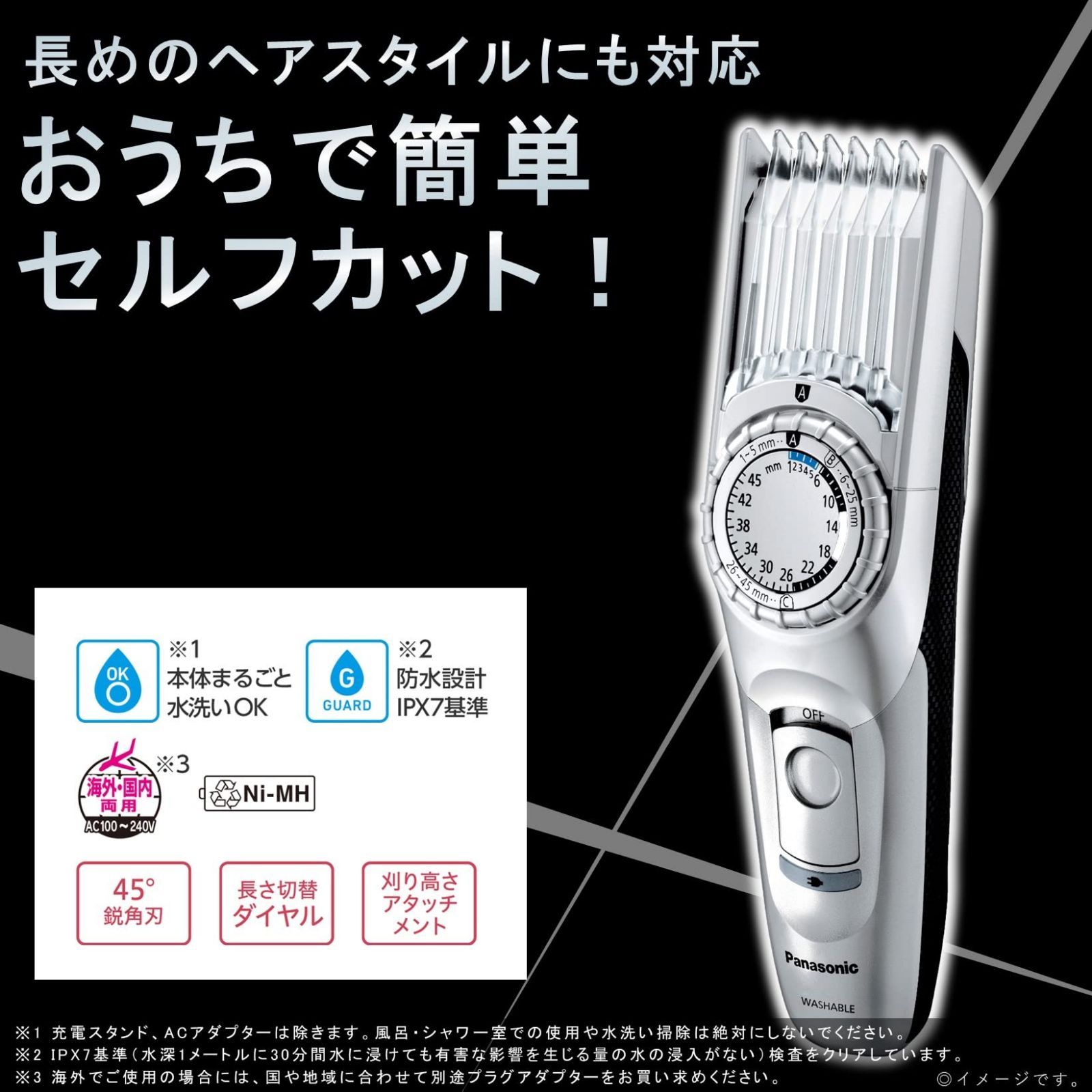●こだわりスタイルが決まる、1mm刻みで調節できるヘアーカッターです。●1mm刻みの46段階(直刃+アタッチメント)でヘアーカットできます。●アタッチメントをつけて本体正面のダイヤルを回すだけで、1~45mmの調節が可能です。●丸刈りからショートスタイルまで、好みの長さにヘアーカットができます。●ヒゲの長さそろえや形づくりで、思い通りのスタイリングができます。●直刃0.5mm+1mm~45mmの46段階調節ができます●ヒゲのスタイリングはもちろん、1mm刻みで調節可能です。●切れ味の良い45°鋭角刃でスパッとカットするので、小幅な刃で細かい部分もあてやすくキレイに仕上がります。●便利に使える、充電・交流式のコードレスタイプです。●ホールドしやすくヘアーからヒゲまで思いのままにスタイリングできます。●本体水洗いOKだからお手入れも簡単でいつも清潔に保てます。●自動電圧切替付(AC100~240V)で国内はもちろん、海外でも使用できます。