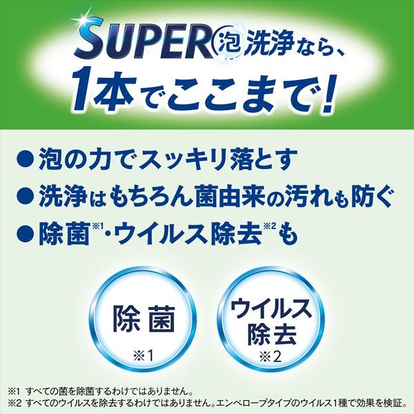 〔浴室用洗剤〕菌由来のヌメリ・ピンク汚れ・黒カビを予防(*1)。「菌汚れ」除去の清掃作業負担を軽減。●除菌(*2)・ウイルス除去(*3)・防カビ・消臭。●湯アカも石けんカスもスッキリ。●中性。*1既に発生している汚れは除去してからお使いください。*2すべての菌を除菌するわけではありません。*3すべてのウイルスを除去するわけではありません。エンベロープタイプのウイルス1種で効果を検証。