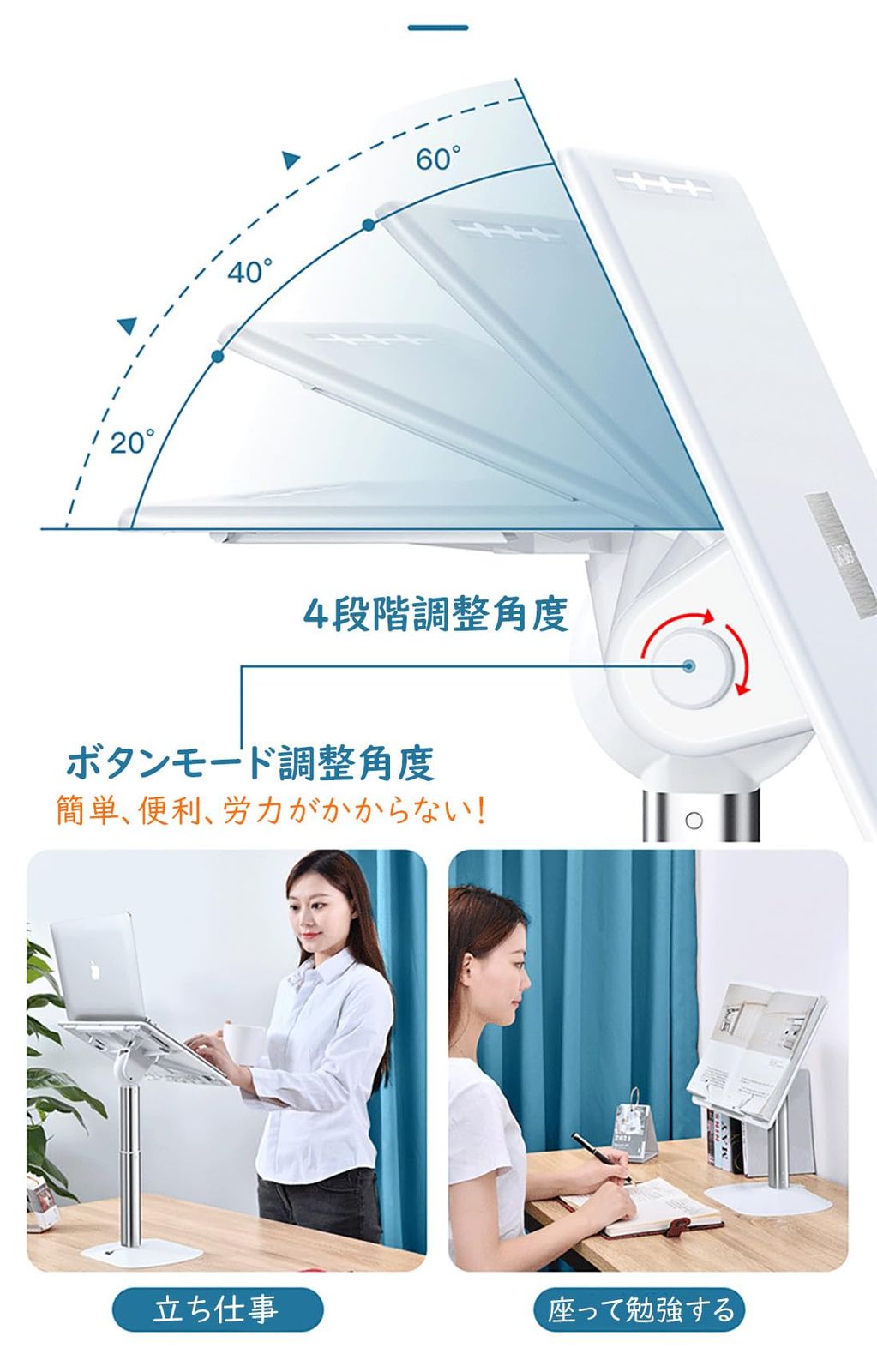 【角度・高さ自由調整】他の読書スタンドと異なり、この書見台は角度調整だけでなく、高さも大幅に調整できます。この読書台は30 ~ 55 cmで高さを調整したり、0 ~ 60°の範囲で角度を調整したりすることができます。角度の可動域があること。可動域が広く。手で簡単に調整でき、子どもも大人も高齢者も使いやすい。サラリーマンはこのブックスタンドを使って腰痛を防ぎ、脊柱のストレスを軽減します。