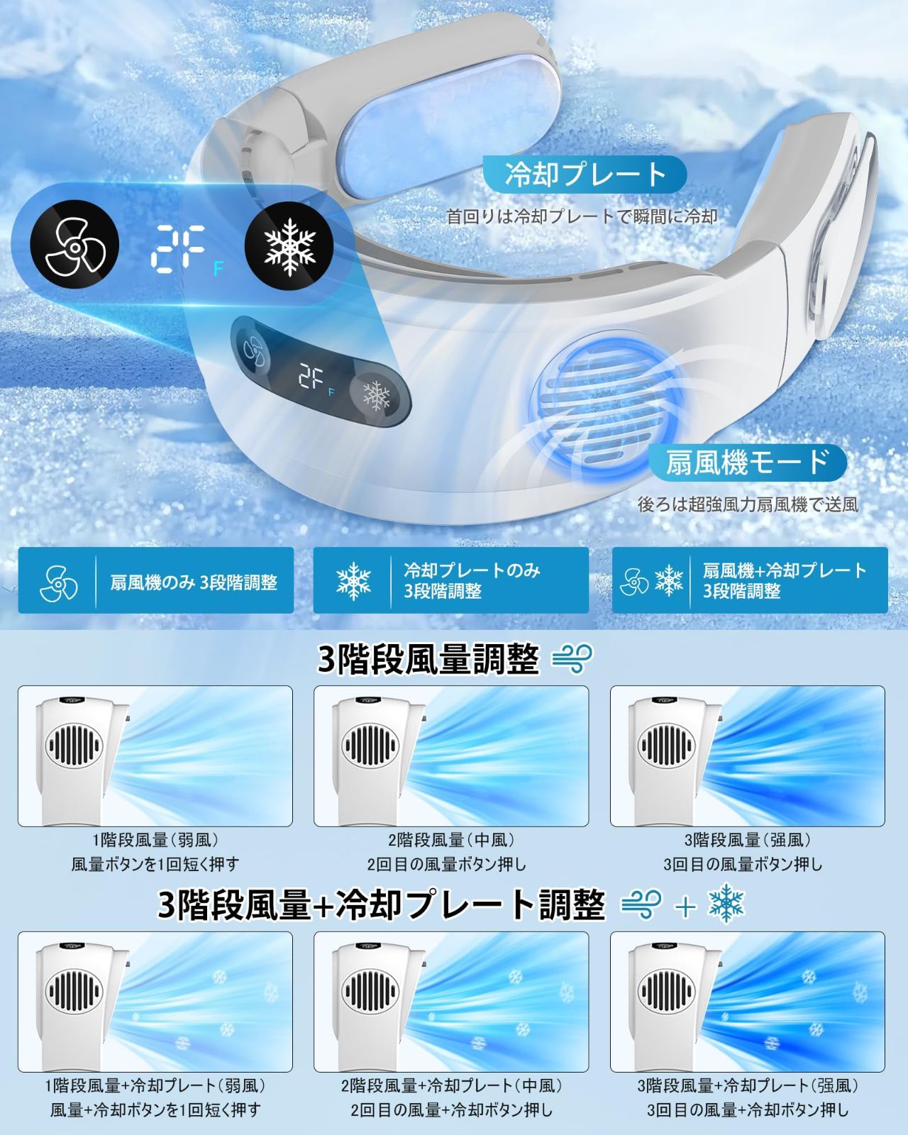 ????【3D上下送風&3段階風量調節】ネックファンの風と冷却プレートが首元に接触することで、首元は周囲温度より-15℃のひんやりと冷たくが感じ、猛暑の中でも快適に過ごせます。このネッククーラーは3段階自由調節できます、ボタンを押すと、風量は強・中・弱の3段階と冷却は弱冷・中冷・強冷の3階段を切り替えることが可能です。 首周りに沿うように装着するネックバンドタイプの携帯扇風機なので、送風口が汗をかきやすい首まわりや顔まわりに効率よく送風できるため、涼しさを感じやすくて、360°の立体風でこれまでにない冷却体験を与えます。
