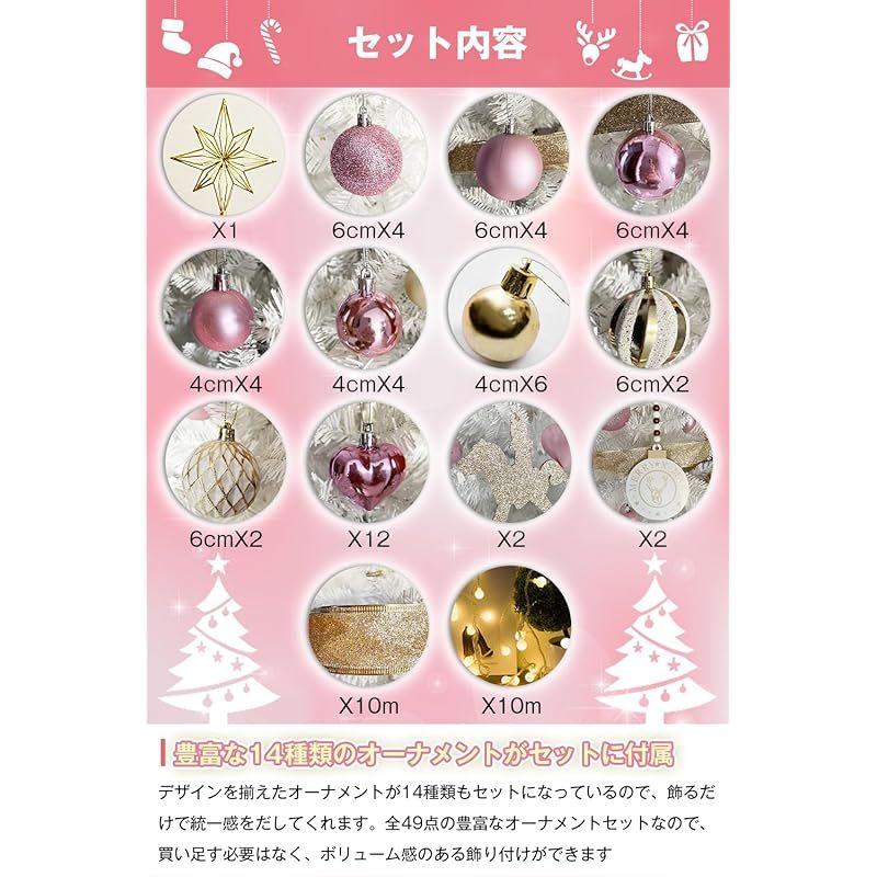 【豪華なオーナメントセット】存在感があり、華やかな印象のクリスマスツリーです。トップスター・メッシュリボン・クリスマスボールなど、全部で14種類のバラエティに富んだオーナメントが付属しています。ツリーに映えるピンクとシャンパンゴールドの2配色でクリスマスムードをより一層盛り上げてくれます。お子様やご家族、友人たちと一緒に心ゆくまでお好みのアレンジをお楽しみください。