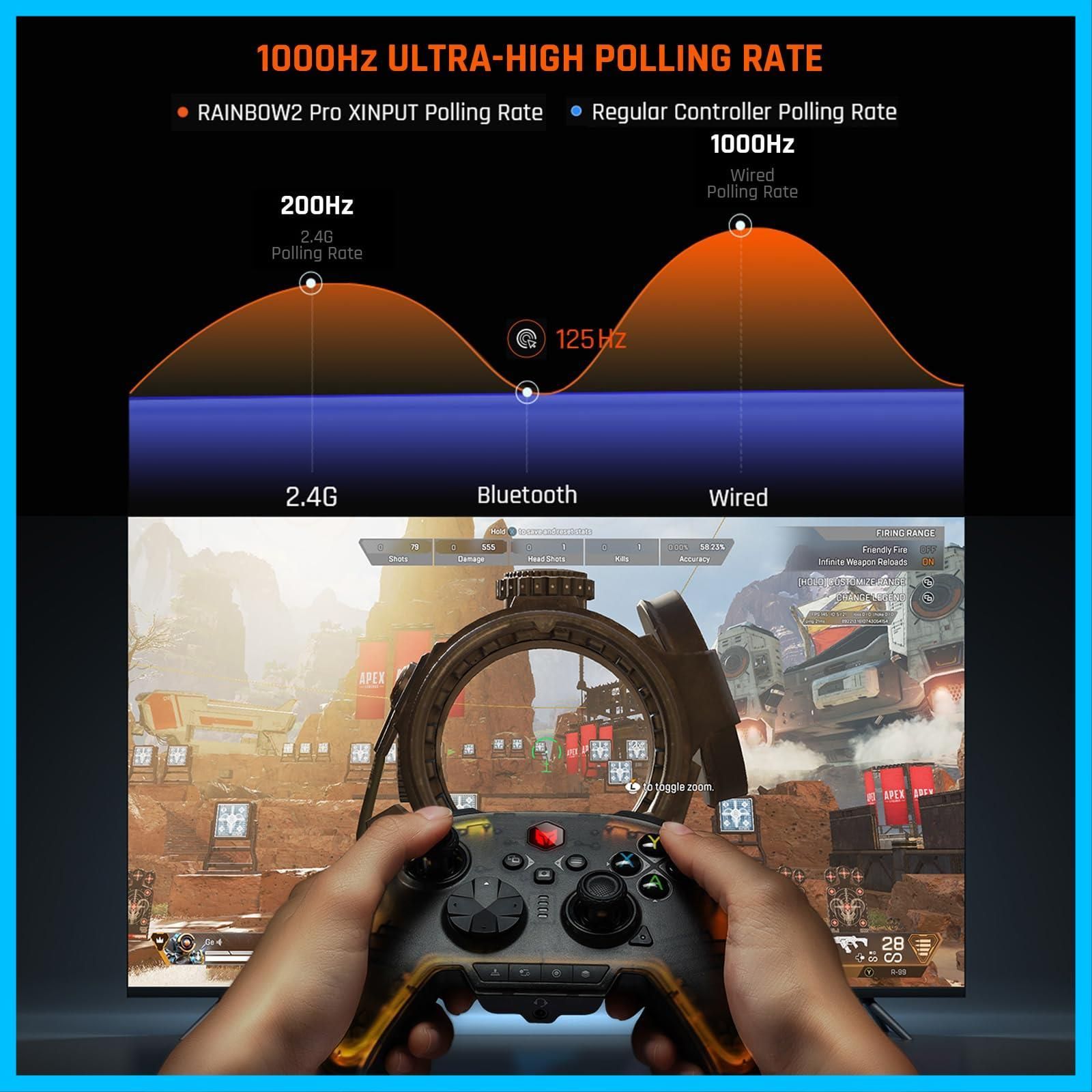 【2.4G USB & Bluetooth & 有線接続】ワイヤレス ゲーム コントローラーは、2.4G ワイヤレス ドングル、Bluetooth、またはさまざまなコンソールに接続する USB ケーブルを介して簡単にゲームをプレイできるように支援し、干渉のない非常に信頼性の高い信号と接続を提供し、ゲームのプレイにも役立ちます。 他のゲームコントローラーと比べて、より自由かつ柔軟に操作できます。 【超高速ポーリングレート】2.4G無線ポーリングレート:200Hz、有線ポーリングレート:1000Hz。***R90 does not work with Rainbow 2 Pro controller.