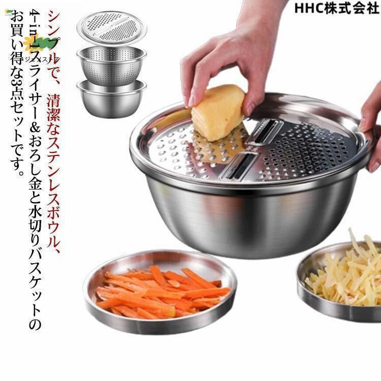 点セット ステンレスボウル 野菜カッター in スライサー&おろし金 千切り 水切り スライサー 米とぎ 調理器具セット 野菜 果物洗
