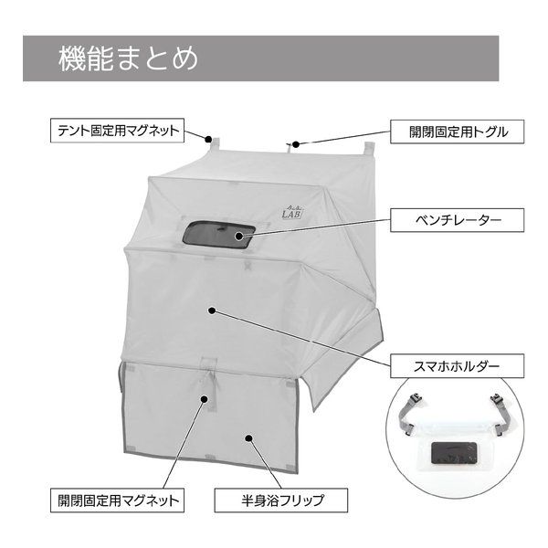 【スマホシアターモード】スマホホルダー搭載で、ハンズフリーでスマホ動画をみる事ができます。【半身浴モード】半身浴フラップを伸ばすことで、テント内の蒸気を効率よくとどめます。