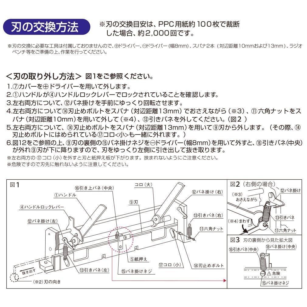 ・PPC用紙約100枚で2000回程度、約160枚でおよそ1200回断裁を目安に研磨又は交換してください
