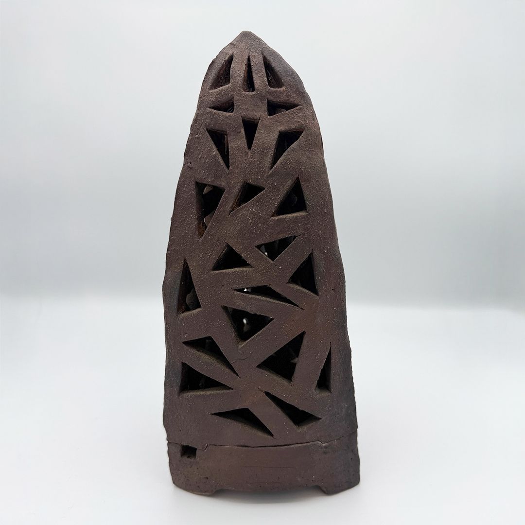 稲葉正幸作、素朴な土味と幾何学の透かし彫りが印象的な陶製香炉です。煙が三角孔から立ちのぼり、空間に静かな余韻を広げます。