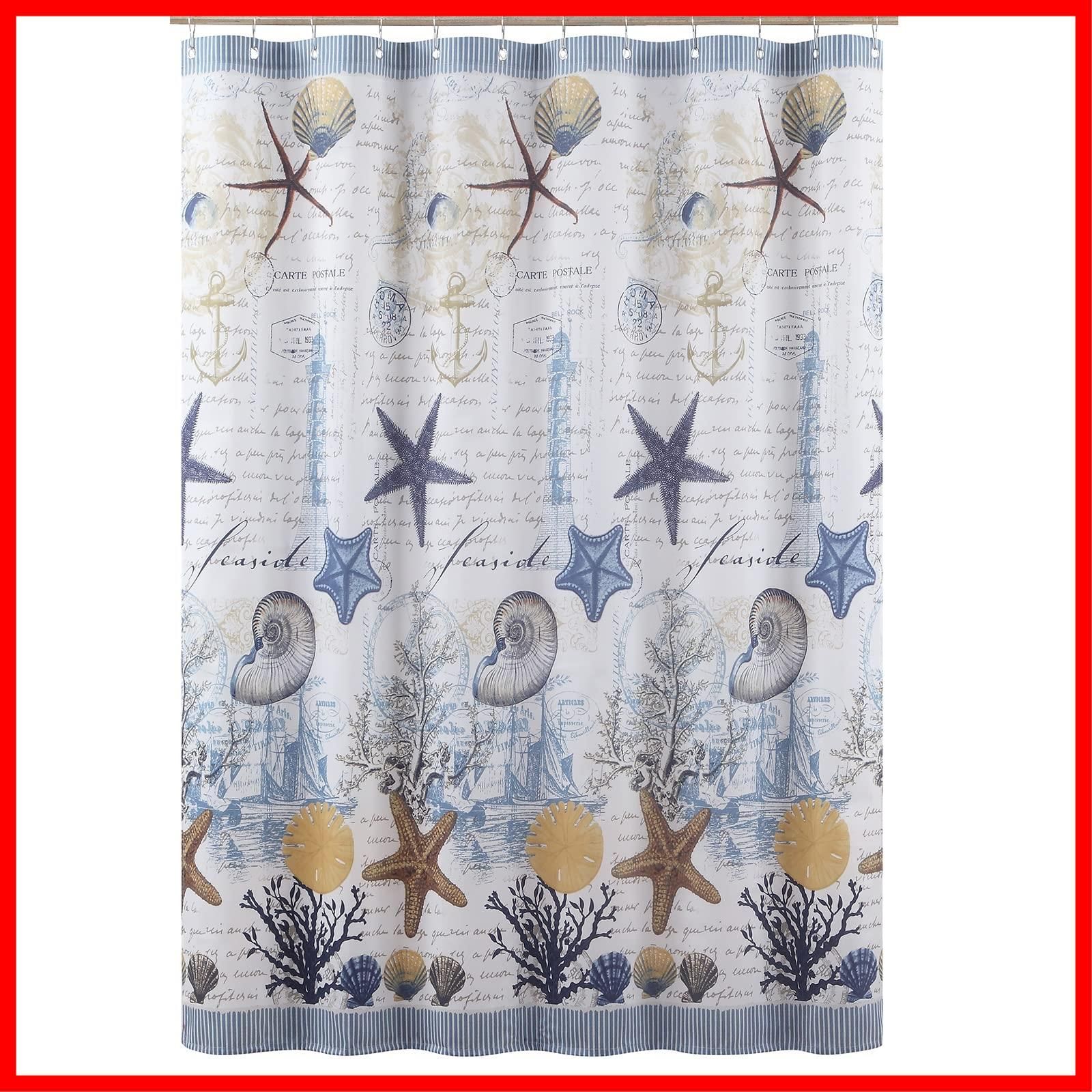 海をテーマにしたストライプの縁の入浴カーテンで、あなたの海辺のリゾートの家をれてこのシンプルなプリントはのヒトデサンゴと帆船の灯台とはがきの背景の美しい色とみ合わせることができます