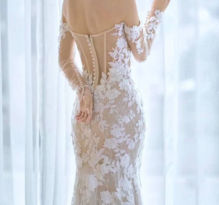 フラワーレース ウェディングドレス 長袖 マーメイド 上品