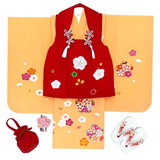 ちょっと 品 七五三 着物 3歳 正絹 フルセット 女の子 友禅 絵羽柄の着物 被布セット 赤x黄色 梅 t 893 set