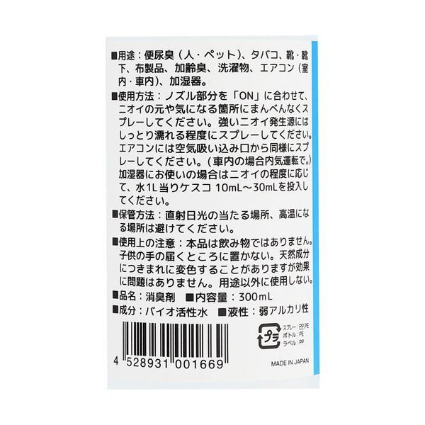 その他仕様:●用途:ふん尿臭(人・ペット)、生ゴミ臭、タバコ、靴・靴下、布製品、エアコン(室内・車内)、加齢臭、部屋干しの洗濯物