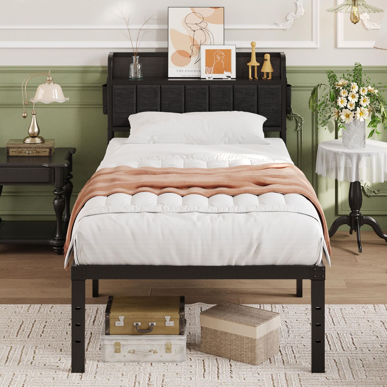【便利なベッドフレーム】このヘッドボード付きのメタルシングルベッドフレームには収納棚と小さなポケットを備えており、本、眼鏡、ランプなどを棚に置くことができ、いつでも取りやすい。これで寝室内をすっきりさせることもできます。