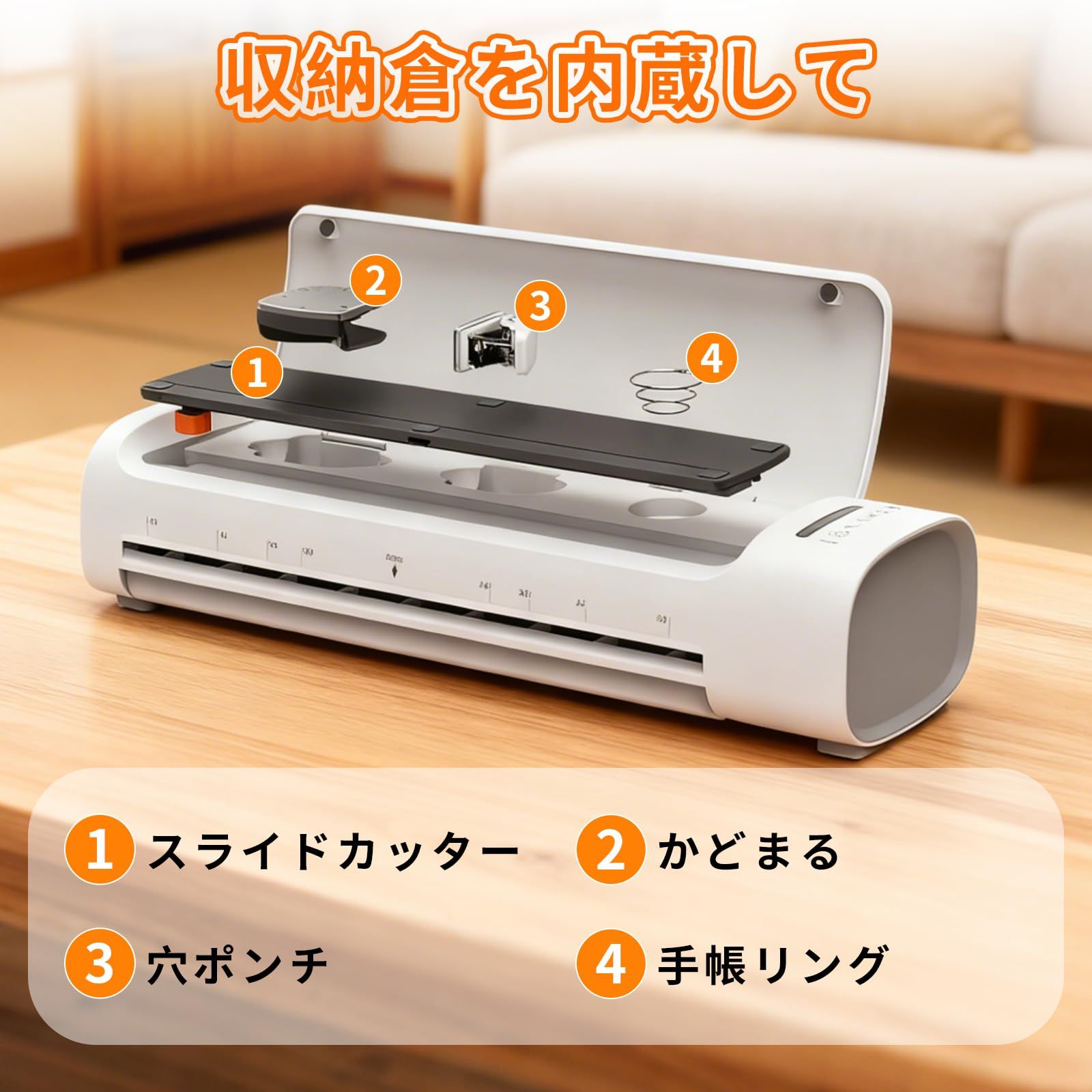 【6-in-1設計 ワンタッチリリース機能】ラミネーターは省スペースで使いやすい収納式デザインを採用しています。ラミネーター本体 ×1、カッター ×1、パンチ ×1、角丸カッター ×1、手帳リング ×3、A3-A6サイズのラミネートフィルム ×5 80mic、ご自宅でも、手軽にお好みのサイズにDIY加工ができ、指を傷つける心配もなく、部品の紛失も防げ、空間を有効活用できます。※ご使用の際は、パンチ、カッター、ノートリング、角丸カッターなど全ての付属品を収納部から取り出してから操作してください。