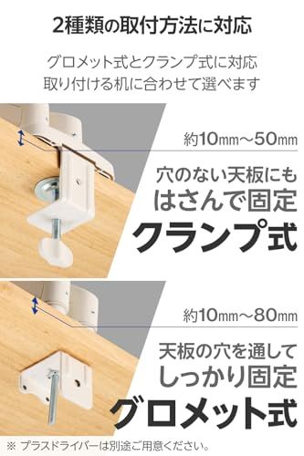 デスクの天板に挟んで固定するクランプ式と、天板に穴を開けてボルトを通して固定するグロメット式の2通りの取り付け方法が選べます。モニター取り付け後の可動がスムーズなのが特徴の製品です。ガススプリングの強さを調節することで、上下可動の硬さを調節することができます。