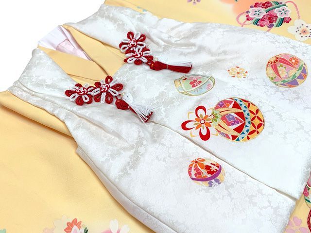 七五三 着物 3歳 正絹 フルセット 女の子 友禅 絵羽柄の着物 被布セット 白x黄赤 鞠 花手鞠 w aWset