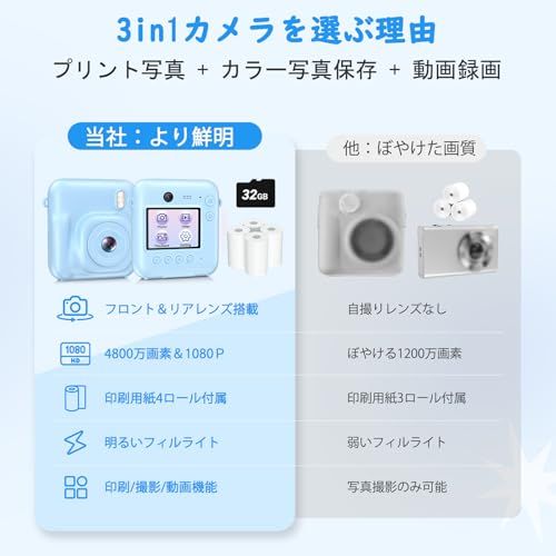 プリントカメラ キッズカメラ トイカメラ 感熱紙 カメラ 4800万画素 1080 P動画 32 GB メモリーカード USB充電 デュアルレンズ 自撮り 印刷機能付き 3-12歳 女の子 男の子 新年のプレゼント子供の日 日 e 996 b 1 fe