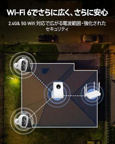 【400万画素・2.4GHz / 5GHz両対応】最新の400万画素高解像度カメラ搭載。色鮮やかで繊細な映像を昼夜問わず表示。PIR人体検知と連動してナイトビジョンLEDライトで夜間もカラー監視可能。また、2.4GHzと5GHz両方のWi-Fiに対応し、干渉が多いエリアでも安定通信が可能。