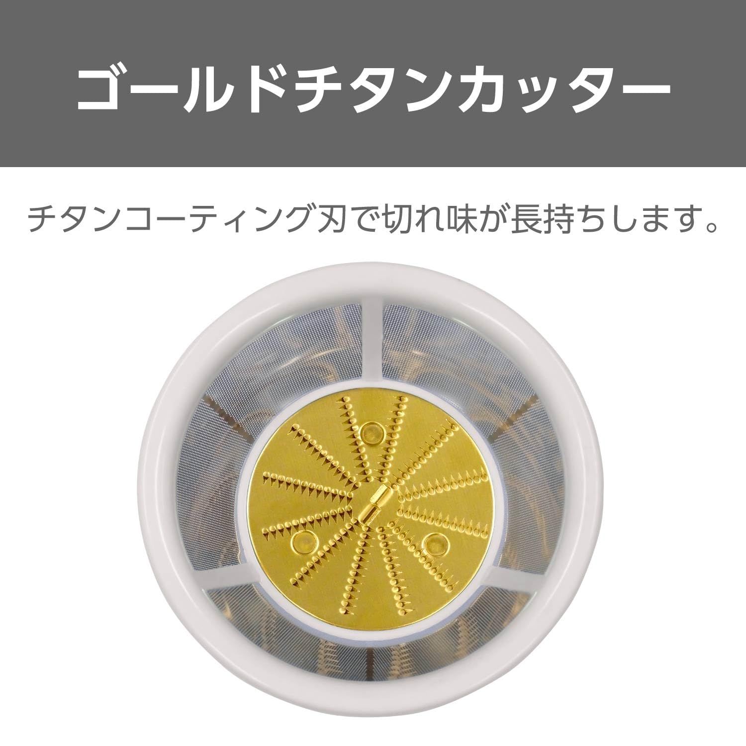 はにんじん、りんご、根菜類などに。 柔らかい食材、硬い食材など、状況に応じて回転速度を切り替えられます。切れ味長持ち、ゴールドチタンカッター※。 ※