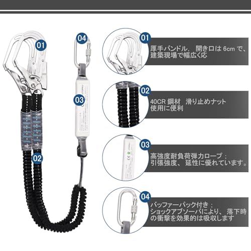 【調整可能なフルハーネス】当社のハーネス安全帯は、あらゆる体格の方に適しています。ユーザーが重量内で適切にフィットするように6点の調整を提供します。ショックアブソーバー付きますので、万が一落下あるいは墜落時、落下する衝撃は体全体に分散し、人体への負担を最低限に軽減します。