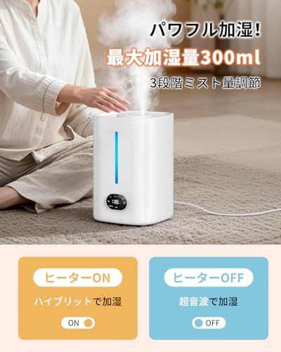 【ハイブリッド式!パワフルかつ清潔に加湿】加熱式x超音波の大容量加湿器は、「加湿能力不足」「雑菌繁殖で不安」などの悩みにサヨナラ!! 最大300mL/hの驚異な加湿能力を持ってます。最大28畳の空間に適応!リビング、寝室、オフィスなど大スペース用の加 湿器としてもストレスなし!5L大容量タンクを使用し、一回の給水で最大25時間と長時間使用できるので、頻繁に給水不要お部屋を乾燥した季節でも快適な湿度を保ちます。お肌や喉の乾燥を防げて病気も予防できます。夜間の給水ストレスから完全に解放され、最長25時間以上の連続運転が可能です。乾燥対策を徹底したい、長時間快適な湿度を保ちたいシーンに最適です。