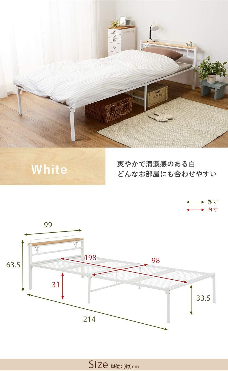 コンパクト 無駄のないシンプルベッド シングル コンセント付き 宮棚セット ベッドフレーム 耐荷重90 kg ベッド ホワイト 萩原 Hagihara KH