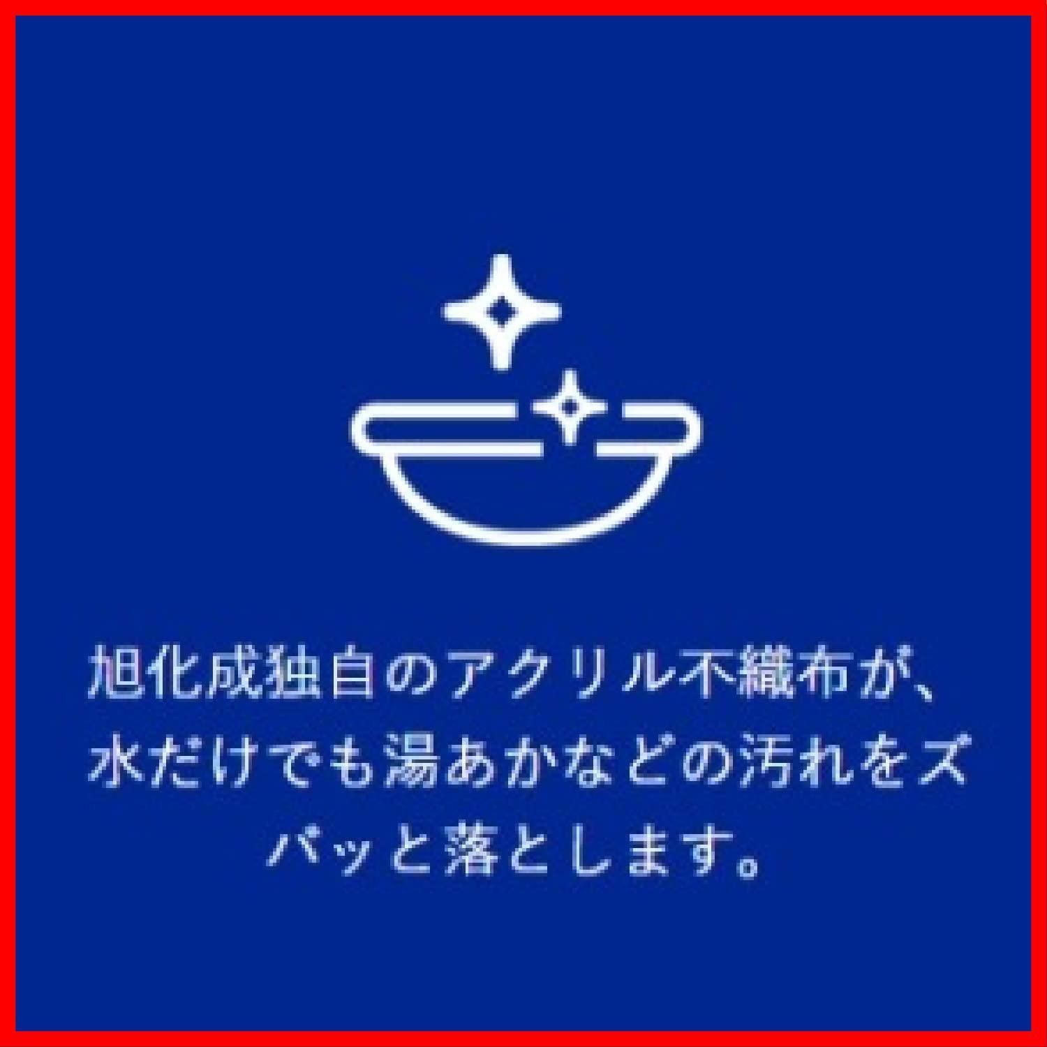 旭化成独自のアクリル不織布が、水だけでも浴槽の湯あかの「ザラつき」や「ヌメリ」を落とします。/研磨材なしだから、壁や床、鏡にも安心して使えます。/形状にくびれがあるので、バス専用の大き目なサイズでも持ちやすく、溝や曲面にもフィットするので、しっかり洗えます。/中間層に脱膜スポンジを使用し、水切れを良くしています。/自立するので、置き場に困りません。