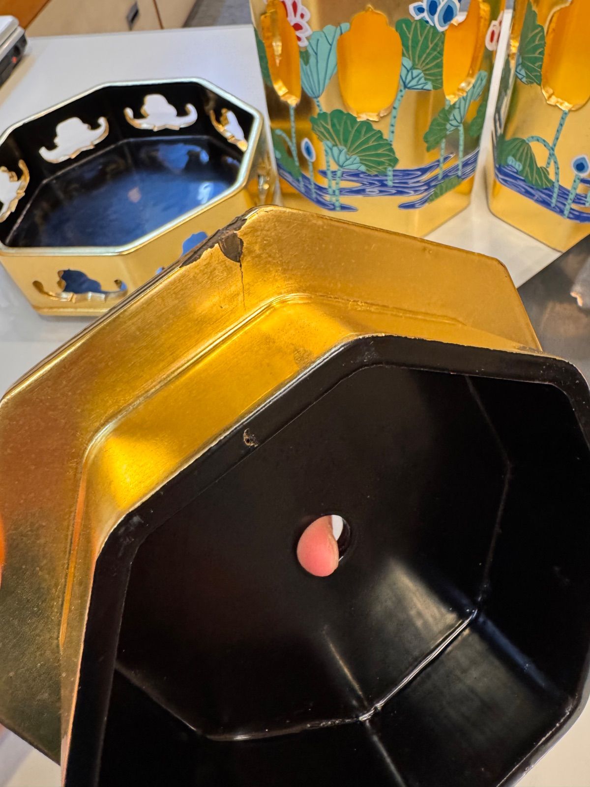 供笥 木製 八角 内外金箔押し 蓮水彩色