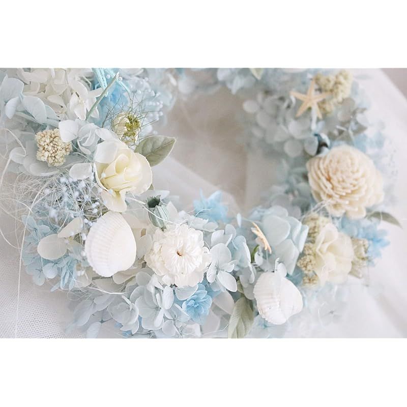 ブルーのベースに季節のお花たちそして貝をお入れしています。 ブルー1色だとちょっと平坦なイメージになり寒々しくなるので ほんのり色の違うブルー3色を使って 海の波の泡の白と 深い海の色に近いグレーのようなグリーンのようなお色のハイドランジアを入れました。 白いふんわりしたシサル麻も使ってふっくらと仕上げています。OPパックにお入れしリース専用ボックス(中が見えないタイプ)にお入れさせていただいておりますのでそのままプレゼントにもお勧めです。 耐久性の強いワックスコード(蝋引きした紐)をつけさせていただいております。 開け閉めの多いドア・直射日光の当たる場所 湿気の多い場所を極力さけて飾っていただければと思います。