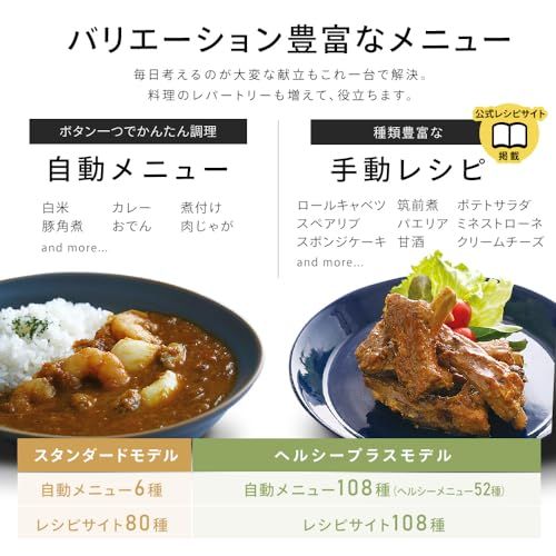 付属品:白米用計量カップ(約180mL/1合)、蒸しプレート、電源コード(マグネットプラグ)、レシピブック