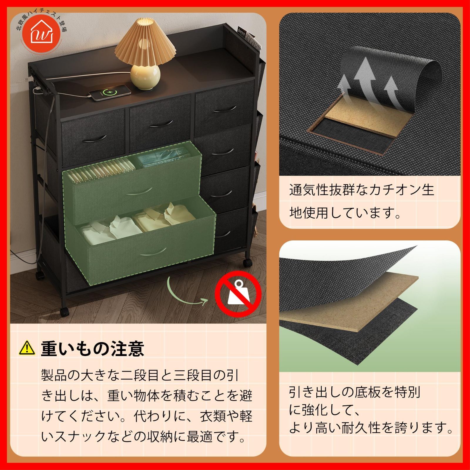 WLIVE チェスト タンス 収納 ファブリックチェスト コンセント付き USBボード キャスター付き サイドポケット付き 4段9杯 箪笥 ハイチェスト リビング収納 おしゃれ 収納チェスト 衣装棚 布製 引き出し 大容量 洋服タンス 衣類収納 北欧 簡単組立 シンプル ブラック ASNG609