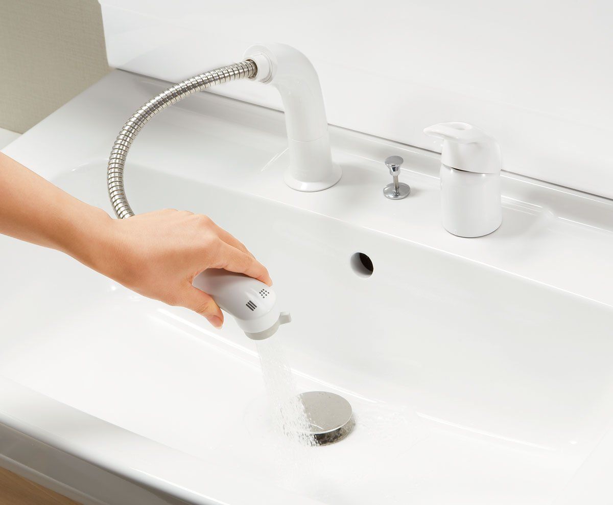 【ハンドシャワーの引出長さが調整可能】ハンドシャワーは最長約350mmまで引き出すことが可能です。洗濯機では洗えない衣類の手洗いや洗面台のお掃除も簡単に。約70mmのリフトアップ機能付きで花瓶などの背の高いものへの水入れもラクラク。