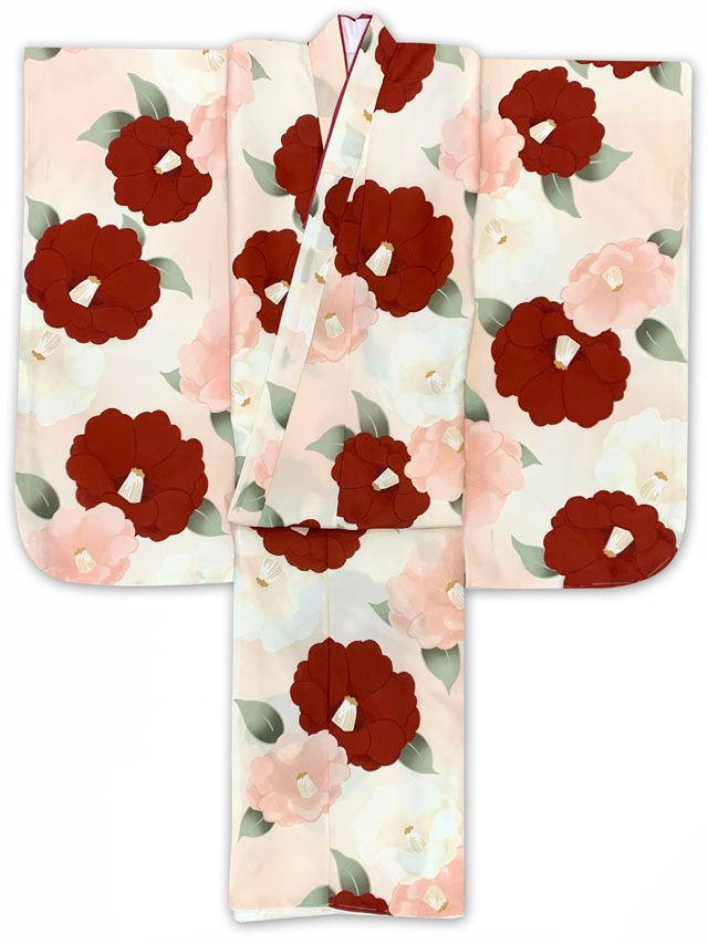 七五三 7歳 女の子用 小紋柄 四つ身の着物と結び帯 他 フルセット ピーチスキンベージュ系 椿 T 7 K 2553 f 991 KSR