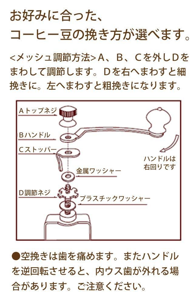 豆の挽き方にこだわるなら、手挽きミルシリーズがおすすめ そのスタイルはインテリアとしても十分にお楽しみいただける コーヒー豆を自分で挽く楽しさ。ハンドルをゆっくりと廻し、ゴリゴリとした音色と挽いているときの豊かな香りが部屋中に広がるのは至福のとき 挽きたてのコーヒーは味も香りも「格別」、いつものコーヒーが特別なコーヒーへ 特別な時間と安らぎが楽しめる コーヒー好きの方への贈り物にもお勧め