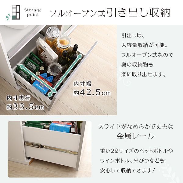 収納スペースを左右に分け、左側に家電収納棚やフルオープンの引出し