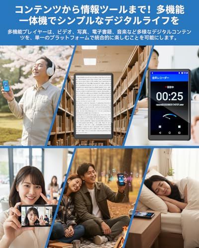 【3.97インチ大画面&Android搭載 動画再生、電子書籍を適度に楽しむ】MP3プレーヤーは3.97インチの大型高精細タッチスクリーン(解像度480*800px)で、動画や画像をクリアに表示。反応の良いタッチ操作で、メニュー選択や曲の切り替えがスムーズ。大画面のため、動画は臨場感たっぷり。電子書籍も文字が大きく読みやすく、目の疲れを軽減します。Androidベースの直感的なオフラインシステムを搭載し、ファイル管理においては、現代的で便利なワイヤレスソリューションを提供します。メディア再生において音楽プレーヤーは、成熟したAndroidエコシステムを活用することで、ほぼ全ての主流動画・画像形式を完璧にサポートして面倒な変換が不要。ページ内の図表やレイアウトもより詳細に確認できます。デザイン面においても、シンプルでモダンなデザインと現代的なフレームが採用され、デバイスの視覚的な魅力を向上させます。(ご注意:動画ファイルをご利用の場合、対応形式はRM、AVI、RMVB、FLV、MP4、DAT、MKV、MPGとなっております。本製品はWi-Fiおよびアプリダウンロードをサポートしておりません。)