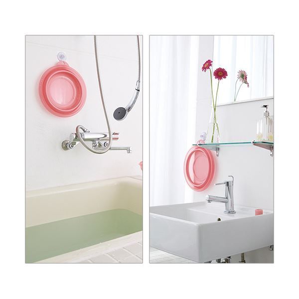 ●折りたたんでコンパクトに収納することができる、ソフト湯おけ。色はピンクです。