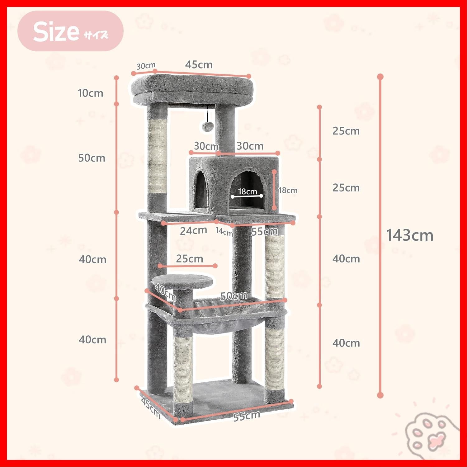 据え置き 多頭飼い 猫タワー 省スペース 登りやすい ハンモック 大型猫用 見晴台 ねこハウス ボンボン スリム 天然麻紐 爪とぎ 運動不足解消 キャットタワー かわいい 組み立て簡単 ぺテぺラ ベージュ 高さ143 cm