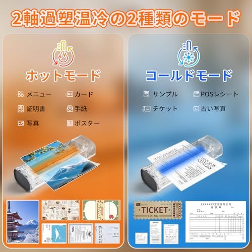 【長時間連続稼働、冷/熱切り替え可能】ラミネート機械は短時間で予熱が完了し、最大120分の連続稼働が可能なので、作業効率が大幅にアップします。ラミネーター対応冷/熱スイッチの切り替え機能が付いており、使う相手によって冷/熱に合わせて使えます。、写真や感熱紙などの特殊な素材にも対応。より多様なニーズに応えるために設計されています。※【ヒント:冷フィルム(含まれません,フィルムは別売り必要です)】