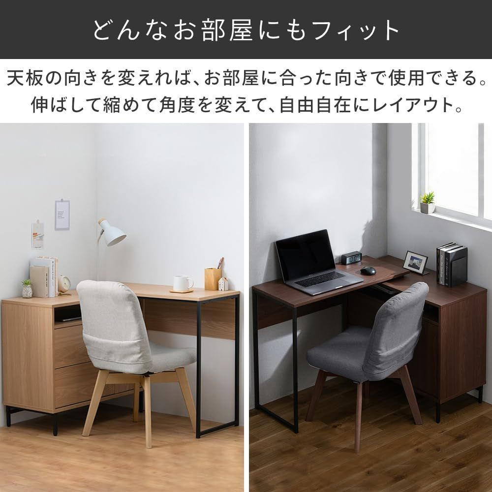 お部屋のレイアウトに合わせて天板のスライドする向きを左右変えたり、L字型に角度を変えてリモートワークなどにも。