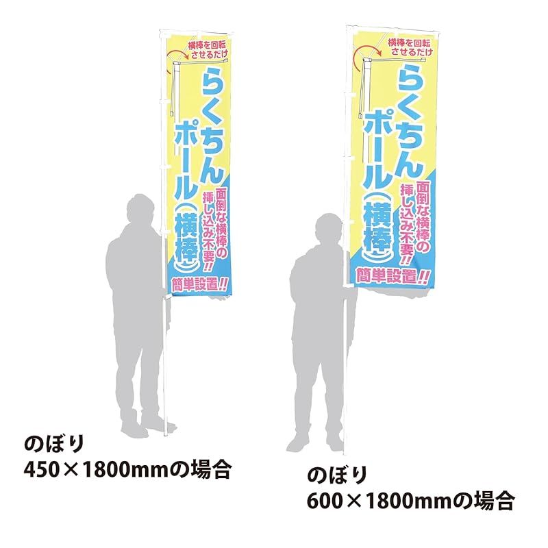 Q.楽ちん横棒とは? A.強風をうまく受け流す回転タイプの頭に差込不要の横棒がセットされています。 のぼり旗の取付はチチテープをくぐらせたら横棒を回転させるだけ!設置時間を大幅短縮!撤去もかんたん!(のぼりを取り付けたまま横棒をたたむことも出来ます)