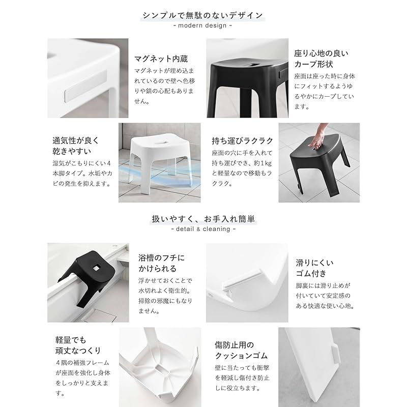 マグネットで浮かせて収納できる、便利なバスグッズ3点セット。浮かせることでスペースを取らず、水切れも良く乾燥もバッチリ!凹凸が少ない洗いやすい形状なのでお手入れしやすいのも嬉しいポイントです。座面は座った時にお尻を包み込むようゆるやかにカーブしており、座り心地よく快適なバスタイムをお過ごしいただけます。セットで揃えることで統一感が生まれ、浴室がスタイリッシュにまとまります。新築祝いなどの贈り物にもおすすめです。