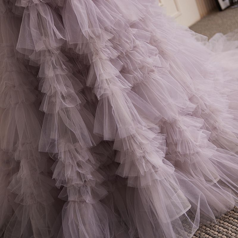 オフショルダー 背中あきウェディングドレス ティアード チュール
