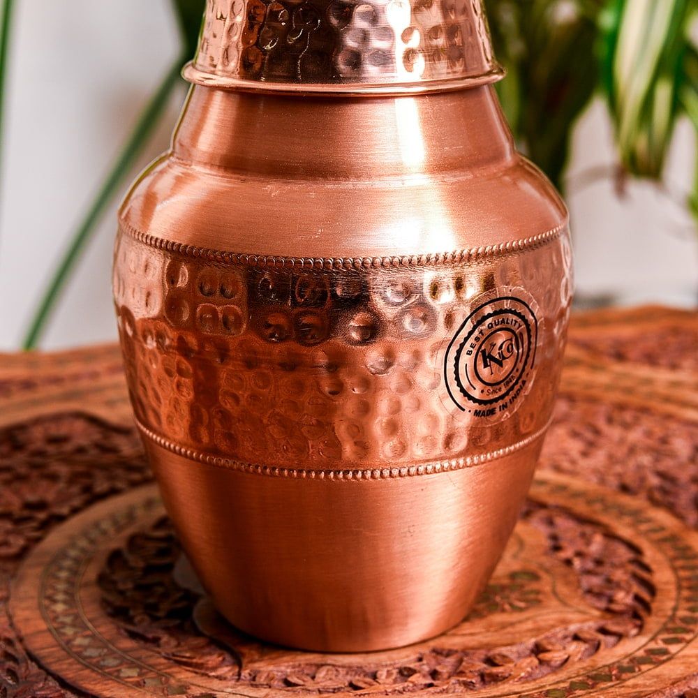 アーユルヴェーダ 銅製コップ付き水差し 槌目仕上げが美しい ウォーターカラフェ ピッチャー 冠水瓶〔約1300 ml〕