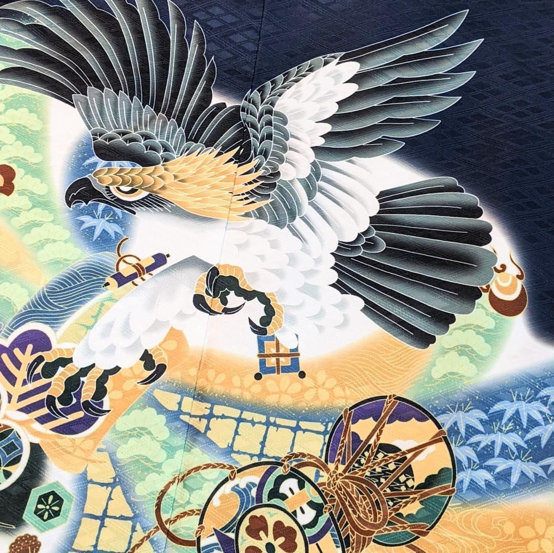 カッコいい紺地に鷹の、着物・羽織・袴のセットです。