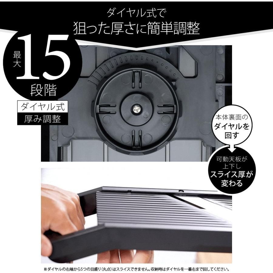 ダイヤルの目盛りの高さは、食材のスライス厚の目安となります。