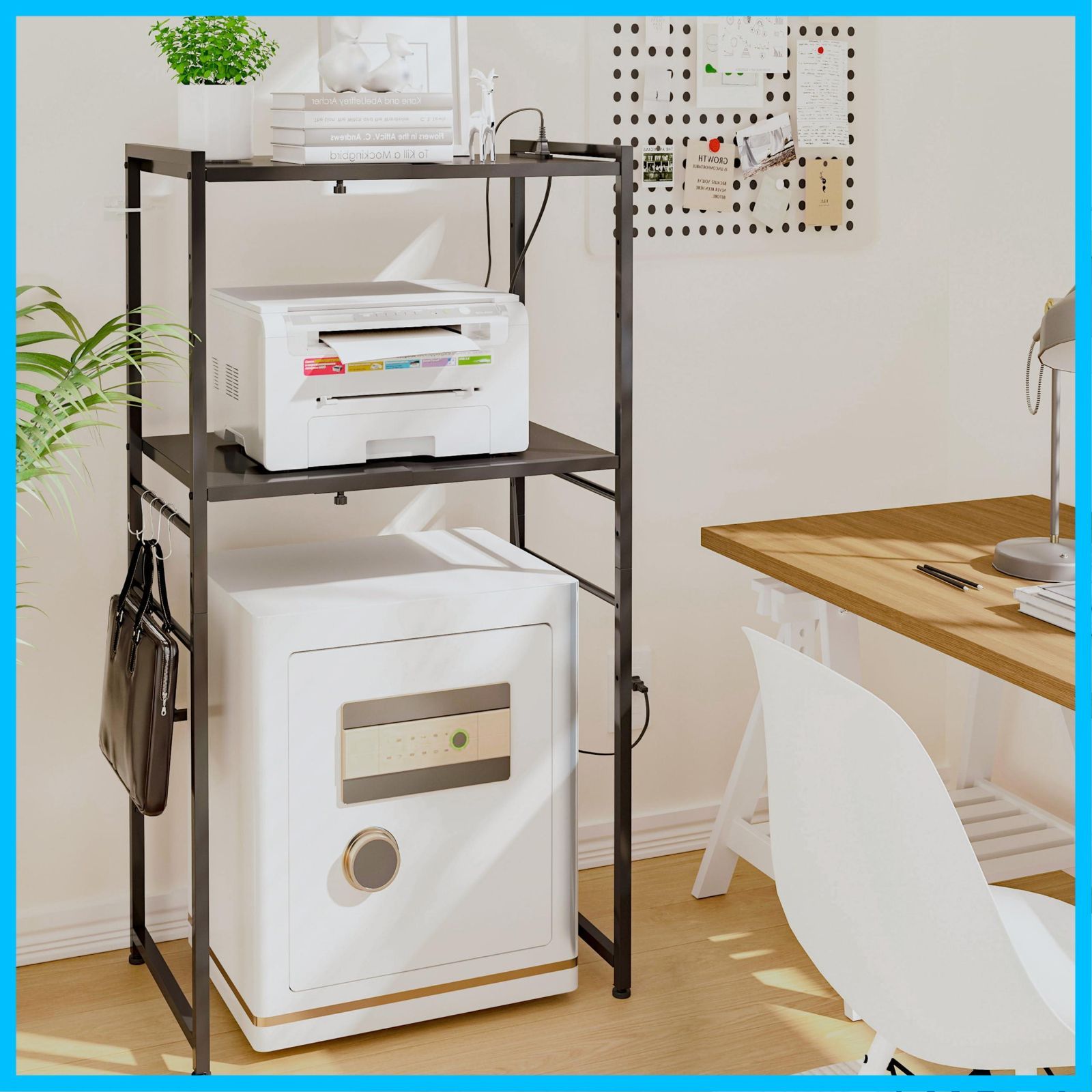 【多機能収納ラック】棚板は収納する物に合わせて高さを調整可能です。約11㎝ぐらいの8段階可動棚で、下部のスペースにはゴミ箱、冷蔵庫、洗濯機などを収納できます。棚板の上部にはレンジ台やプリント台などを置くことができます。