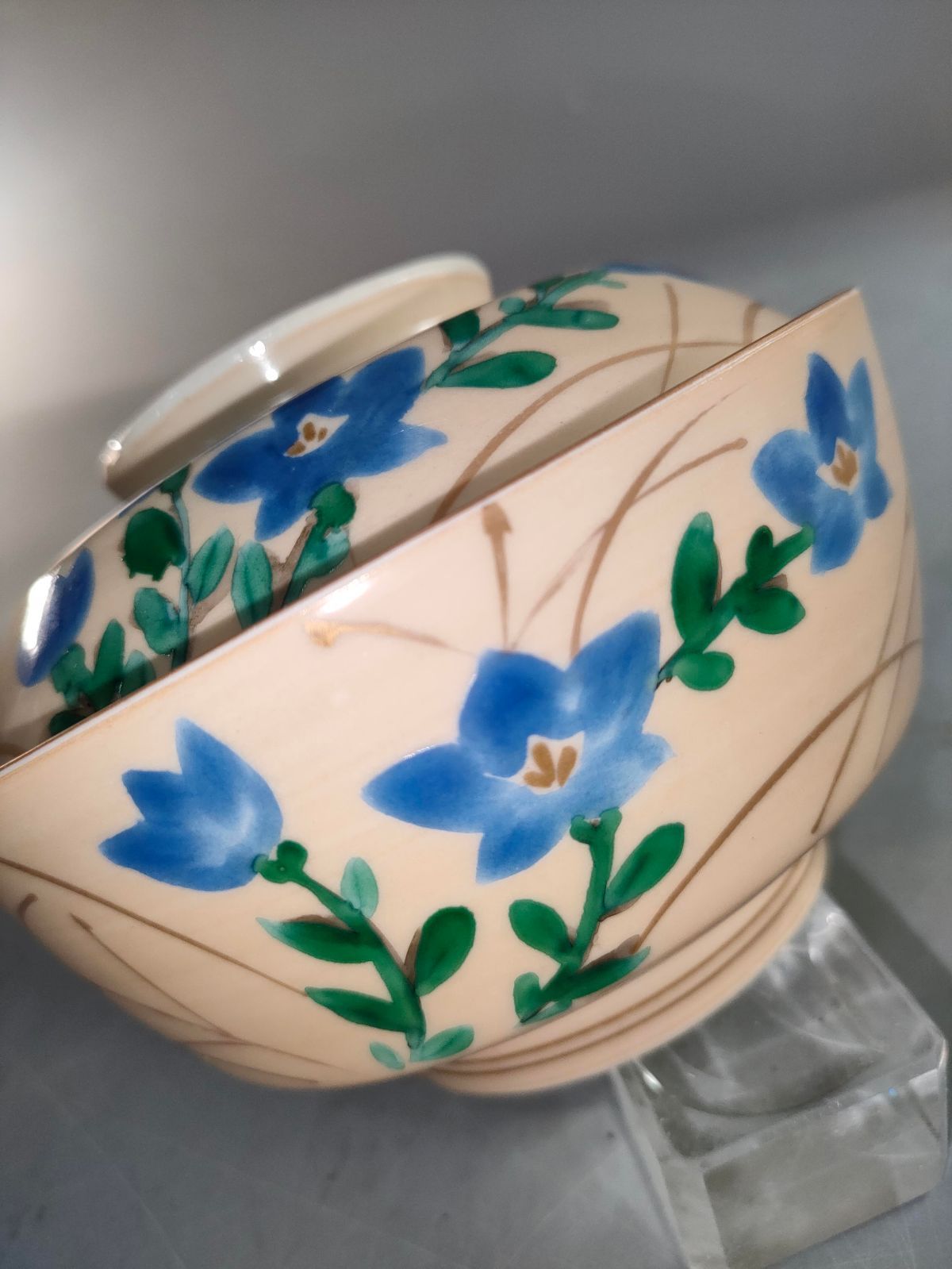 S 8 12 京焼 清水焼 平安橘吉 着彩草花文絵蓋向付 茶碗10客 蓋9客 懐石道具