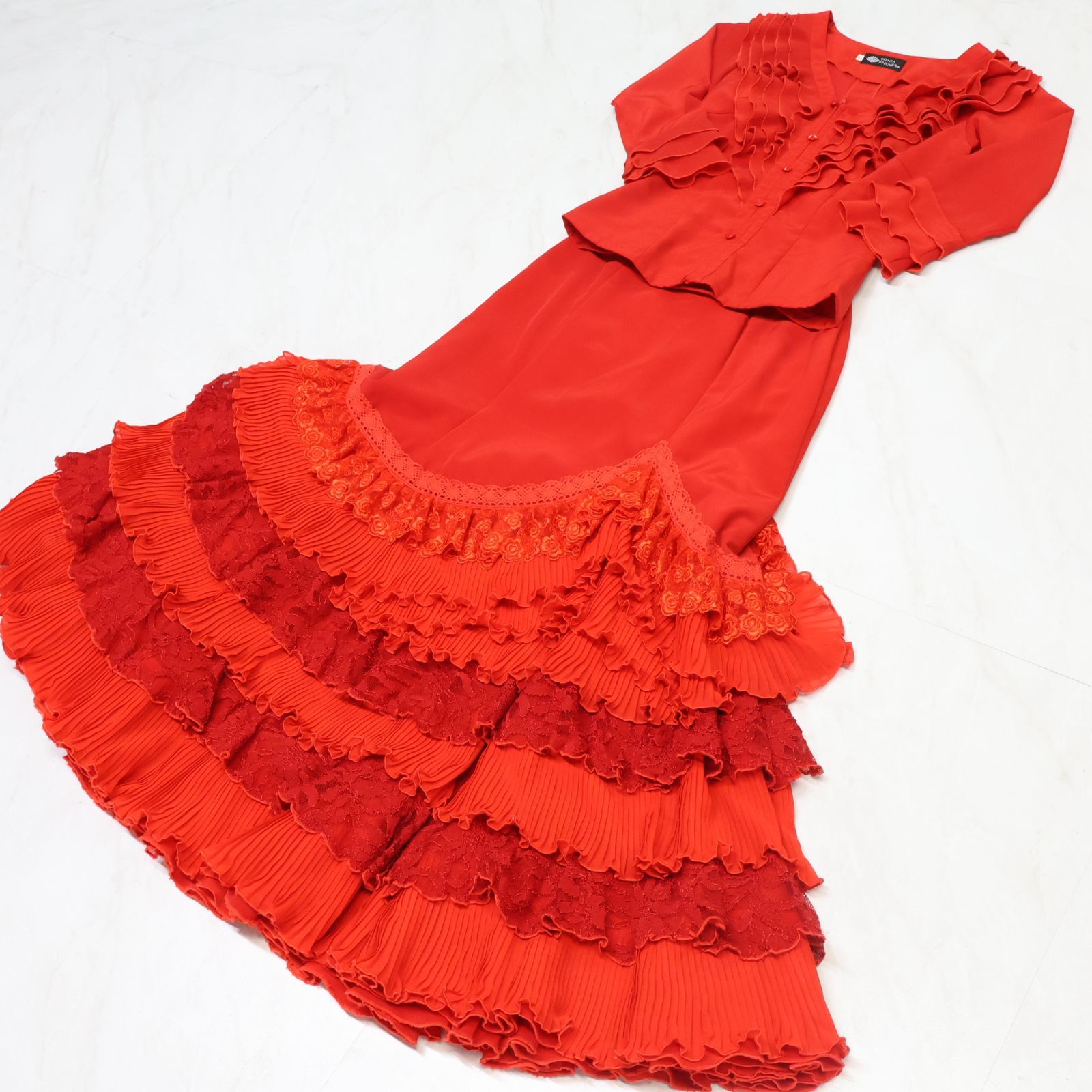 フラメンコ衣装 レッド SONIA JOHNES ソニアジョーンズ 上下セット ツーピース 赤 ボランテ フリル レース 長袖 単色 発表会 レディース 袖有り