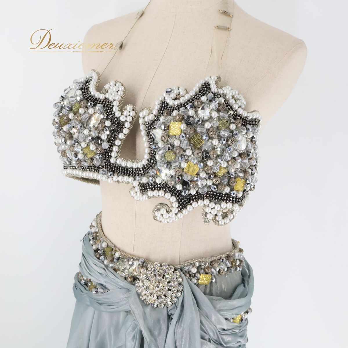 エジプト製 ベリーダンス用オリエンタル衣装 グレー Eman Zaki ラインストーン シルバー 黒 パール ラメ レース 煌びやか 灰色 銀色 ブラック セットアップ 上下セット トップス スカート 装飾 豪華 重量感 レディース 女性用