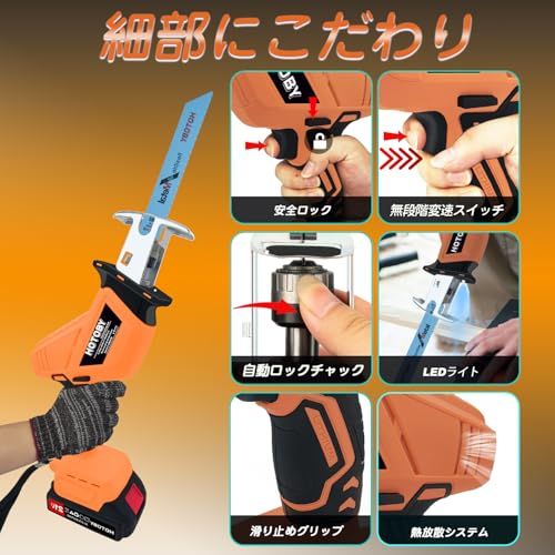 【利便性が高く、安全にも大事に!】 自動ロックチャックにより、ブレードの交換が工具不要で楽々!刃の取り付けと取り外しが素早くできます!無段変速スイッチが搭載し、スイッチの引き加減により、作業し始めを容易にしたり、相手材に合わせたスピードに調整することができます。安全確保が最優先事項であり、安全ロックボタンが付きなので、不意な誤操作・誤起動が防止します。